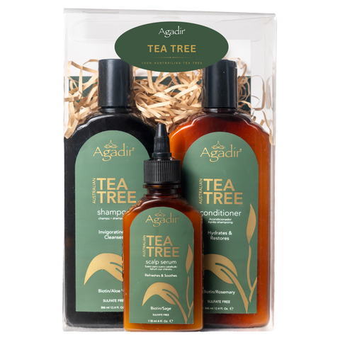 [{"id":273821007954,"handle":"all-products","title":"All Products","updated_at":"2025-12-24T07:17:49-05:00","body_html":"","published_at":"2023-09-29T16:07:40-04:00","sort_order":"best-selling","template_suffix":"template2","disjunctive":true,"rules":[{"column":"variant_price","relation":"greater_than","condition":"1.00"}],"published_scope":"web"},{"id":153280577618,"handle":"holiday-gift-sets","title":"Holiday Gift Sets","updated_at":"2025-12-18T10:59:24-05:00","body_html":"","published_at":"2019-10-20T15:12:11-04:00","sort_order":"best-selling","template_suffix":"template2","disjunctive":false,"rules":[{"column":"tag","relation":"equals","condition":"gift"}],"published_scope":"web"},{"id":292409835602,"handle":"tea-tree","updated_at":"2025-12-24T07:17:49-05:00","published_at":"2025-11-24T12:37:49-05:00","sort_order":"best-selling","template_suffix":"template2","published_scope":"web","title":"Tea Tree Collection","body_html":"\u003cp align=\"center\" class=\"MsoNormal\" style=\"text-align: center;\"\u003e\u003cb\u003e\u003cspan style=\"mso-fareast-font-family: 'Times New Roman'; color: black;\"\u003eAgadir Tea Tree Collection\u003c\/span\u003e\u003c\/b\u003e\u003cspan style=\"mso-fareast-font-family: 'Times New Roman'; color: black;\"\u003e\u003c\/span\u003e\u003c\/p\u003e\n\u003cp class=\"MsoNormal\"\u003e\u003cspan style=\"mso-fareast-font-family: 'Times New Roman'; color: black;\"\u003eHealthy hair begins with a healthy scalp. The new \u003cb\u003eAgadir Tea Tree Collection\u003c\/b\u003e is designed to purify, soothe, and rebalance from the roots up. Featuring a \u003cb\u003eShampoo, Conditioner, and Scalp Serum\u003c\/b\u003e, this refreshing three-step system deeply cleanses buildup, calms irritation, and restores hydration — leaving your scalp clean, cool, and comfortable.\u003c\/span\u003e\u003c\/p\u003e\n\u003cp class=\"MsoNormal\"\u003e\u003cspan style=\"mso-fareast-font-family: 'Times New Roman'; color: black;\"\u003ePowered by \u003cb\u003eTea Tree Oil\u003c\/b\u003e, \u003cb\u003eAloe Vera\u003c\/b\u003e, and \u003cb\u003evitamin-rich botanicals\u003c\/b\u003e, each formula works together to cleanse impurities while delivering long-lasting moisture and scalp relief.\u003c\/span\u003e\u003c\/p\u003e\n\u003cdiv style=\"text-align: center;\" align=\"center\" class=\"MsoNormal\"\u003e\u003chr align=\"center\" width=\"100%\" size=\"2\"\u003e\u003c\/div\u003e\n\u003cp align=\"center\" class=\"MsoNormal\" style=\"text-align: center;\"\u003e\u003cb\u003e\u003cspan style=\"mso-fareast-font-family: 'Times New Roman'; color: black;\"\u003eWhy It’s Different\u003c\/span\u003e\u003c\/b\u003e\u003cspan style=\"mso-fareast-font-family: 'Times New Roman'; color: black;\"\u003e\u003c\/span\u003e\u003c\/p\u003e\n\u003cp class=\"MsoNormal\"\u003e\u003cspan style=\"mso-fareast-font-family: 'Times New Roman'; color: black;\"\u003eWhile many tea tree products can feel harsh or drying, \u003cb\u003eAgadir’s Tea Tree line\u003c\/b\u003e blends purifying ingredients with hydrating botanicals for the perfect balance. The result is a line that detoxifies the scalp without stripping away essential moisture. This line is suitable for all hair types, even color-treated or dry hair.\u003c\/span\u003e\u003c\/p\u003e\n\u003cp class=\"MsoNormal\"\u003e\u003cspan style=\"mso-fareast-font-family: 'Times New Roman'; color: black;\"\u003eThis line goes beyond surface care to truly \u003cb\u003enormalize the scalp\u003c\/b\u003e, relieve dryness and tightness, and encourage an environment for \u003cb\u003estronger, healthier growth\u003c\/b\u003e.\u003c\/span\u003e\u003c\/p\u003e\n\u003cdiv style=\"text-align: center;\" align=\"center\" class=\"MsoNormal\"\u003e\u003chr align=\"center\" width=\"100%\" size=\"2\"\u003e\u003c\/div\u003e\n\u003cp align=\"center\" class=\"MsoNormal\" style=\"text-align: center;\"\u003e\u003cb\u003e\u003cspan style=\"mso-fareast-font-family: 'Times New Roman'; color: black;\"\u003eThe Routine\u003c\/span\u003e\u003c\/b\u003e\u003cspan style=\"mso-fareast-font-family: 'Times New Roman'; color: black;\"\u003e\u003c\/span\u003e\u003c\/p\u003e\n\u003cp class=\"MsoNormal\"\u003e\u003cb\u003e\u003cspan style=\"mso-fareast-font-family: 'Times New Roman'; color: black;\"\u003eStep 1: Tea Tree Shampoo\u003c\/span\u003e\u003c\/b\u003e\u003cspan style=\"mso-fareast-font-family: 'Times New Roman'; color: black;\"\u003e\u003cbr\u003eStart fresh. This aloe-enriched shampoo penetrates deep to remove buildup, excess oil, and residue while providing instant relief for dryness, itchiness, or tightness. It gently cleanses and invigorates the scalp, leaving hair refreshed and ready to absorb moisture.\u003c\/span\u003e\u003c\/p\u003e\n\u003cp class=\"MsoNormal\"\u003e\u003cb\u003e\u003cspan style=\"mso-fareast-font-family: 'Times New Roman'; color: black;\"\u003eStep 2: Tea Tree Conditioner\u003c\/span\u003e\u003c\/b\u003e\u003cspan style=\"mso-fareast-font-family: 'Times New Roman'; color: black;\"\u003e\u003cbr\u003eFollow with this daily anti-breakage conditioner to rebalance and detangle. Infused with Tea Tree Oil, Aloe, and \u003cb\u003eJojoba Oil\u003c\/b\u003e, it helps prevent dryness and flaking while stimulating circulation at the scalp for healthier growth. Hair feels smooth, hydrated, and easy to manage.\u003c\/span\u003e\u003c\/p\u003e\n\u003cp class=\"MsoNormal\"\u003e\u003cb\u003e\u003cspan style=\"mso-fareast-font-family: 'Times New Roman'; color: black;\"\u003eStep 3: Tea Tree Scalp Serum\u003c\/span\u003e\u003c\/b\u003e\u003cspan style=\"mso-fareast-font-family: 'Times New Roman'; color: black;\"\u003e\u003cbr\u003eFinish your routine with the targeted treatment your scalp deserves. This lightweight serum delivers cooling relief for dry, itchy, or flaking areas while moisturizing with Aloe and essential vitamins. With regular weekly use, it helps reduce future scalp irritation and maintain long-term comfort.\u003c\/span\u003e\u003c\/p\u003e\n\u003cdiv style=\"text-align: center;